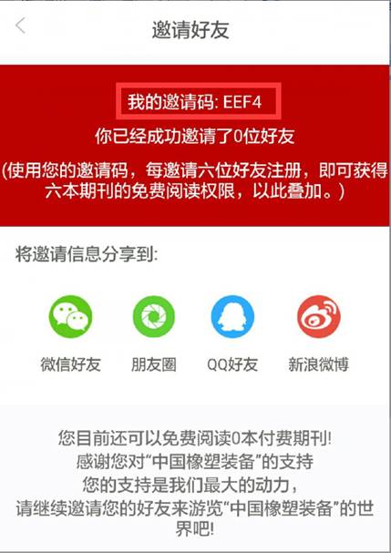您每邀請六位好友下載“中國橡塑裝備APP”,并在注冊時(shí)填上您的邀請碼成功注冊后,您即會(huì )擁有六本收費期刊的免費閱讀權限。