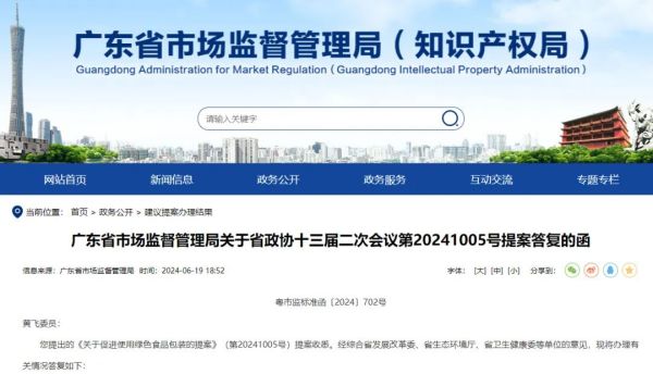 廣東?。褐С挚山到馑芰嫌糜谑称钒b!6月19日,廣東省市場(chǎng)監督管理局發(fā)布《關(guān)于省政協(xié)十三屆二次會(huì )議第20241005號提案答復的函》(以下簡(jiǎn)稱(chēng)《答復》),針對政協(xié)第十三屆廣東省委員會(huì )委員、常委黃飛提出的《關(guān)于促進(jìn)使用綠色食品包裝的提案》予以答復,《答復》綜合了省發(fā)展改革委、省生態(tài)環(huán)境廳、省衛生健康委等單位的意見(jiàn)?! 洞饛汀繁硎?,十分認同提案中強化監管和宣傳教育,出臺立法促進(jìn)生物基可降解綠色包裝材料的普及應用;加強對相關(guān)企業(yè)的培育和扶持,引導企業(yè)研發(fā)環(huán)保替代材料,推動(dòng)綠色包裝產(chǎn)業(yè)發(fā)展的建議?! ∠乱徊綄⒓涌炀G色產(chǎn)品認證推廣和采信工作,推廣應用綠色塑料制品等綠色產(chǎn)品,支持可降解綠色塑料產(chǎn)品用于食品包裝,促進(jìn)綠色生產(chǎn)和綠色消費。支持高新企業(yè)研發(fā)新型綠色環(huán)保包裝材料,并參照綠色產(chǎn)品認證有關(guān)標準和認證規則開(kāi)展新型自愿性認證。 2024-06-24 【節能環(huán)?!?/div>